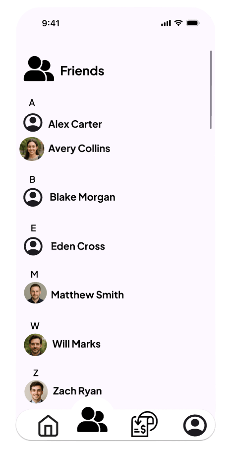 Movement through the app can be found using the icons at the bottom, presented as: Home, Friends, Transaction History, and Profile.