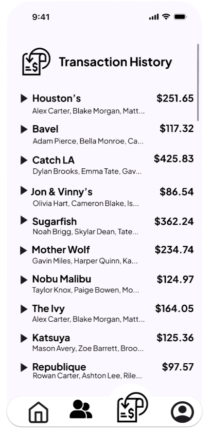 Users can view their previous transactions, including the cost, participants, and other details.